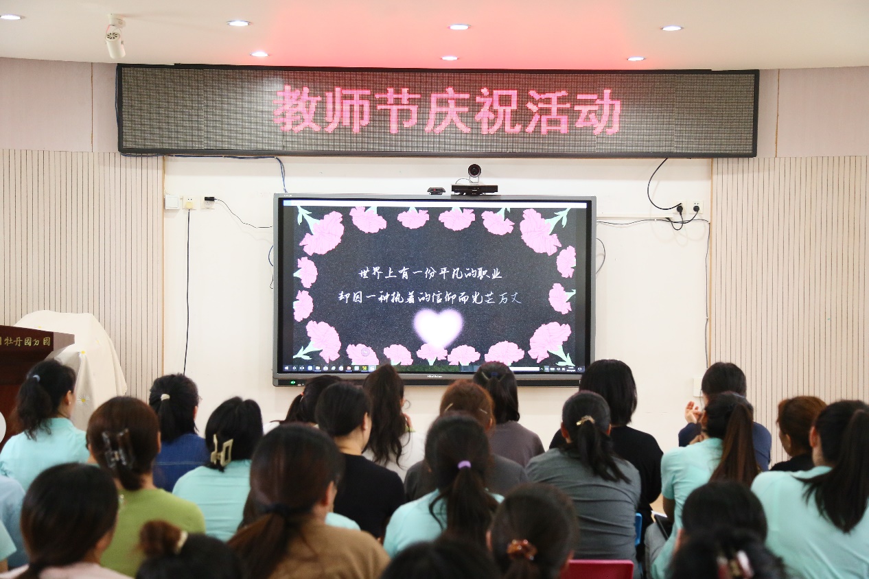 2023年9月8日,在第39个教师节来临之际,牡丹分园开展了主题为“躬耕教坛 强国有我”教师节庆祝活动。幼儿园工会为全体教职工献上了教师节特别视频——《闪闪发光的你》,向全体教职工致以节日问候。