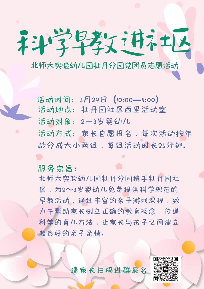 2023年3月29日,为了深入贯彻党的二十大精神,正规滚球app官方网站牡丹分园携手花园路街道牡丹园社区,开展“科学早教进社区” 党团员志愿活动。本次活动由牡丹分园党员和团员参与,为幼儿园所在社区的2-3岁婴幼儿免费提供科学规范的早教活动,通过丰富的亲子游戏课程,致力于帮助家长树立正确的教育观念,传递科学的育儿方法,让家长与孩子之间建立起良好的亲子亲情。