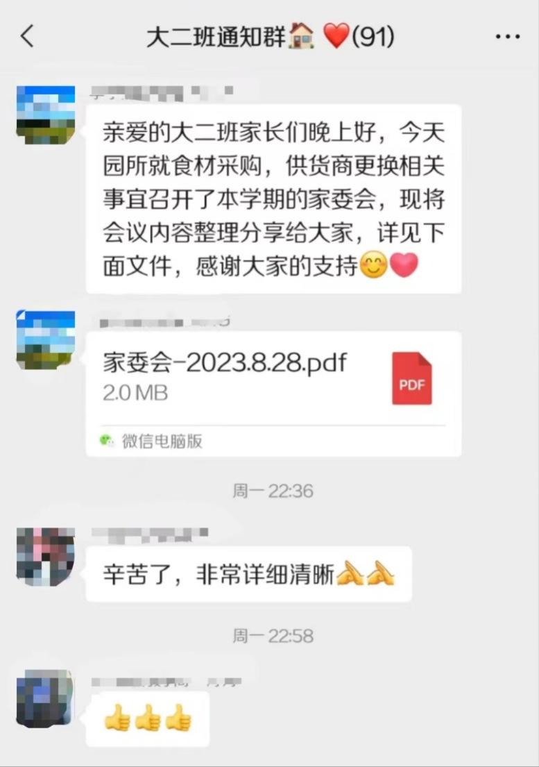 执行园长多次带领总务主任、保健室、厨房、库房、财务,学习领会大宗采购的重要意义,结合园所以往工作,认真商讨梳理经验和问题、整理和供货商合作和问题清单,于2023年8月21日与中央批发市场高管和具体负责人4人进行线上会议,就质量要求,人员健康,订货送货要求,票据结账,赔付要求等方面进行沟通,达成共识。2023年8月28日园方组织召开了家委会,12名家长代表参会,会上对园所食品安全工作的重视,管理途径,所有食材的供货资质,大宗采购重要意义、部分到期食材供货变更为大宗采购的情况作了具体介绍,还专门安排大宗采购教委委托的承接方——中央批发市场的孙经理对公司发展现状,食材质量,服务优势等进行全方位的介绍,家长代表一致表示理解,信赖与认同,并就家长关心问题进行简答。各班家长代表也积极做好面向家长的宣传工作,确保我园大宗采购家长知情,信息公开,便于后续接受家长的监督。