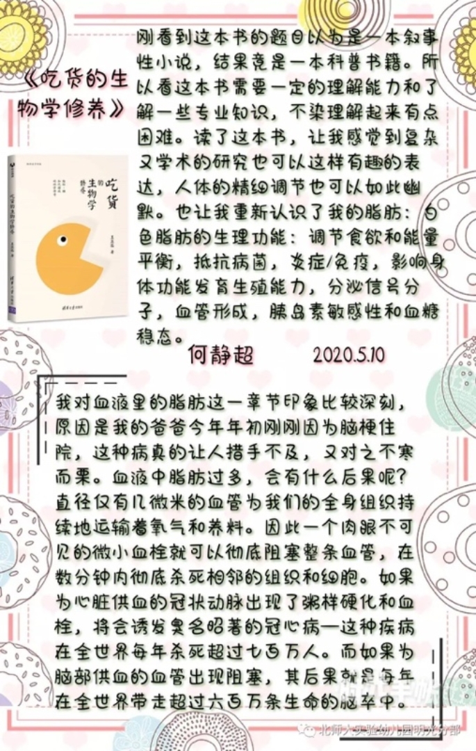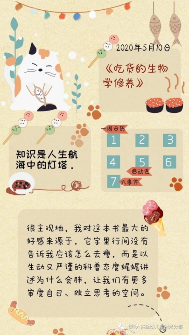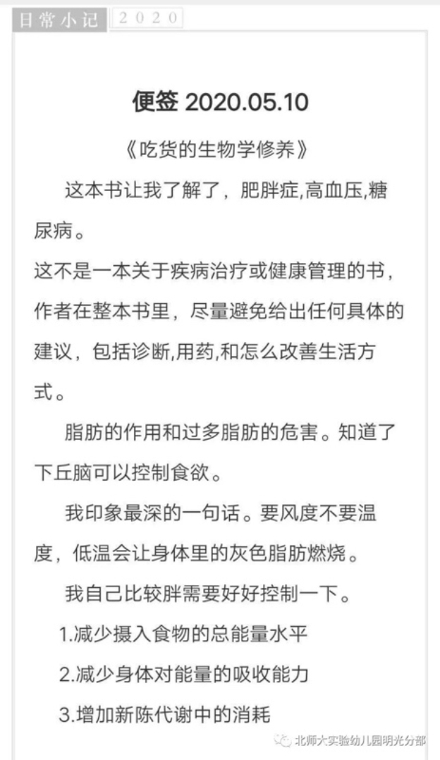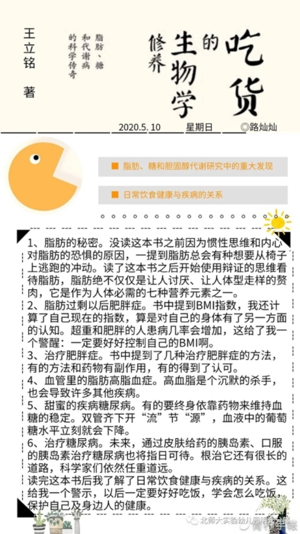 通过这次阅读,滚球app知道了身体里脂肪和糖的秘密,了解到了关于肥胖、高血脂和糖尿病的故事,教师们对自己身体健康的认识也进一步加深了。第一次以小组线上活动形式进行阅读,第一次利用手账这个软件记录自己的感悟······每一个第一次都是对自己的挑战。教师们在这个第一次中不断学习和摸索,用心且详细的记录下了满满的干货与感慨。相信在这之后,滚球app都会知道该如何做一名科学又健康的“吃货”。
