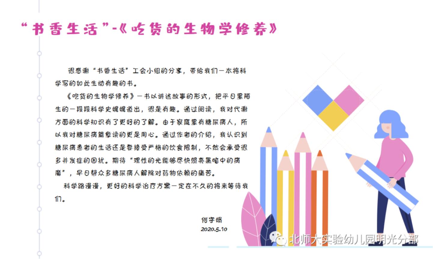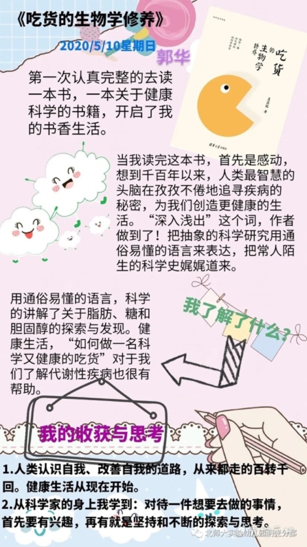 在物质丰富的现代社会,每个人都是“吃货”,琳琅满目的美食对滚球app有着强大的吸引力,而“吃”却和滚球app的身体健康紧密相连。贴近生活,从饮食开始关注健康,静下心来,享受沉浸式阅读带来的喜悦。教师们用一周的时间从书籍原文、公众号文章、相关视频等推送中选择出自己感兴趣的进行自主阅读,并用手账的形式记录阅读感悟。