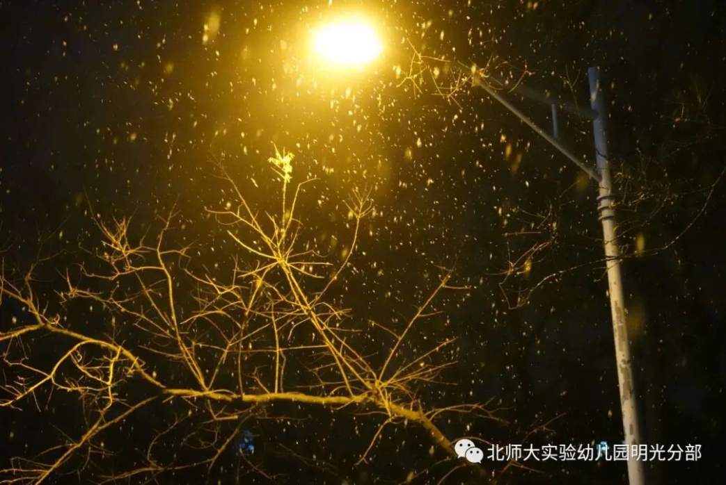 看到纷纷扬扬的雪花往下落,大家惊喜万分?。从在幼儿园的校门口开始,录视频、唱歌疯了一路。我心里默念:“很高兴,能和喜欢的人一起看初雪。”我的心情和照片中一样,满天雪花、寒冷落在枯枝上。橘黄色的路灯像太阳~