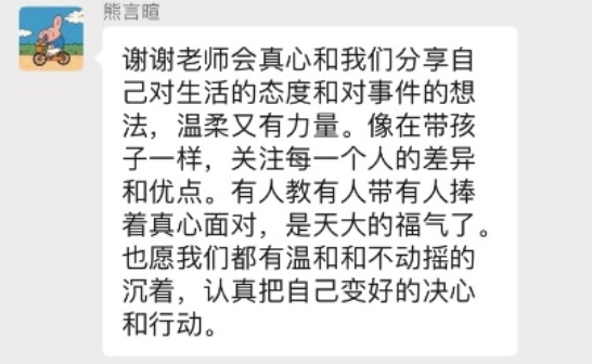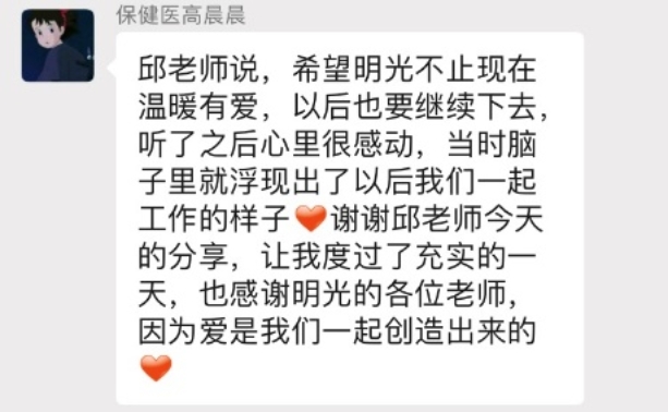 娓娓道来的讲述,也引发了老师们的些许触动和有感而发。这也是明光教师对黄珊总园长提出的“幸福工作,卓越发展”的一种践行。