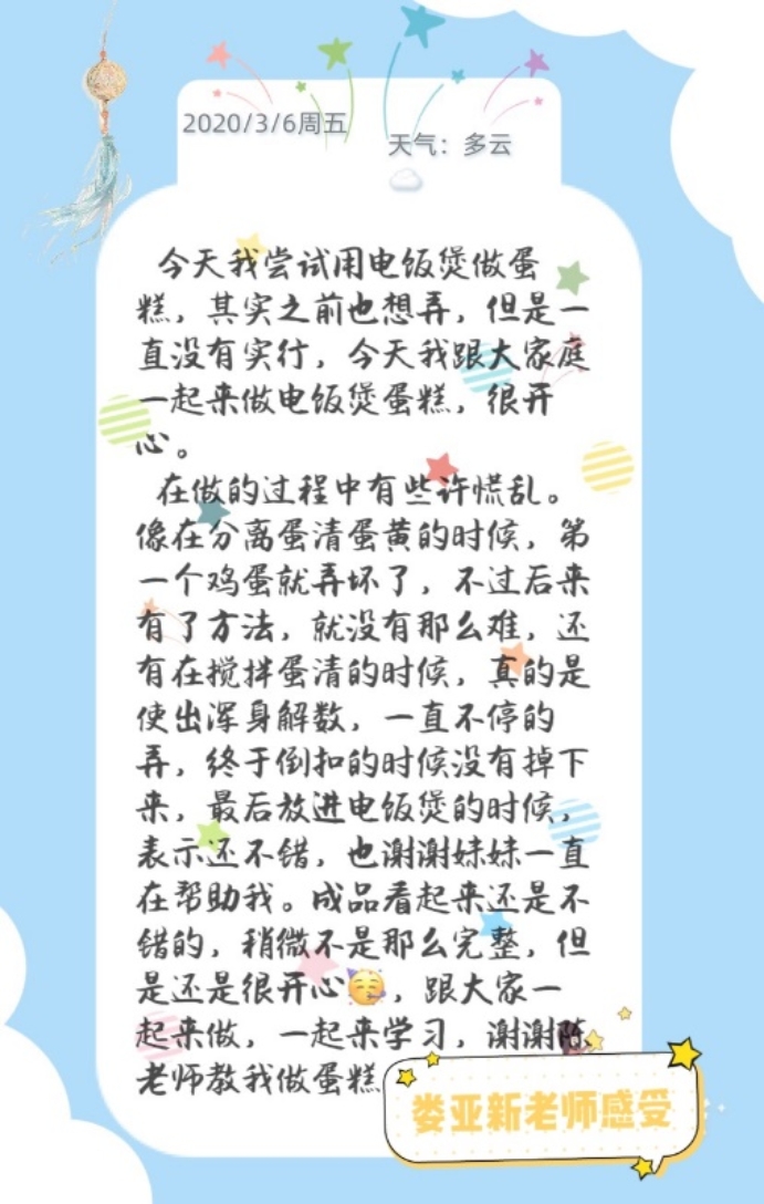 3月6日下午,明光工会小组长陈宁老师自身就是“烘焙爱好者”,她考虑到有些老师家中烘焙工具有限,选择了最简单的电饭煲蛋糕制作,在线示范和指导。一下午的快乐时光,大家工具各异,情况各异,状况百出,笑点不断,成品卖相也各不相同,但活动中无论个人还是全家总动员,大家都愉悦了身心,乐意融融。生活是需要这样去触摸和感受体验的。