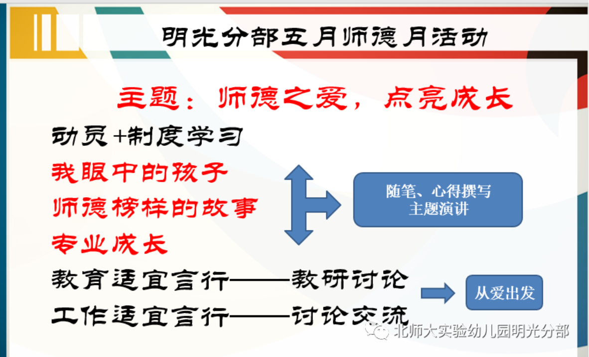 师德之爱,是一种氛围,是一种影响,也是一种能力。围绕园所整体安排,两位主任分别从“适宜的教育言行”“适宜的工作言行”组织相关的教研,以此提升岗位教师德能兼备的能力。