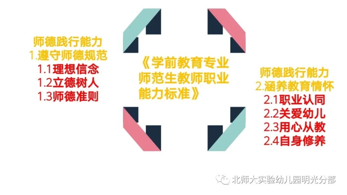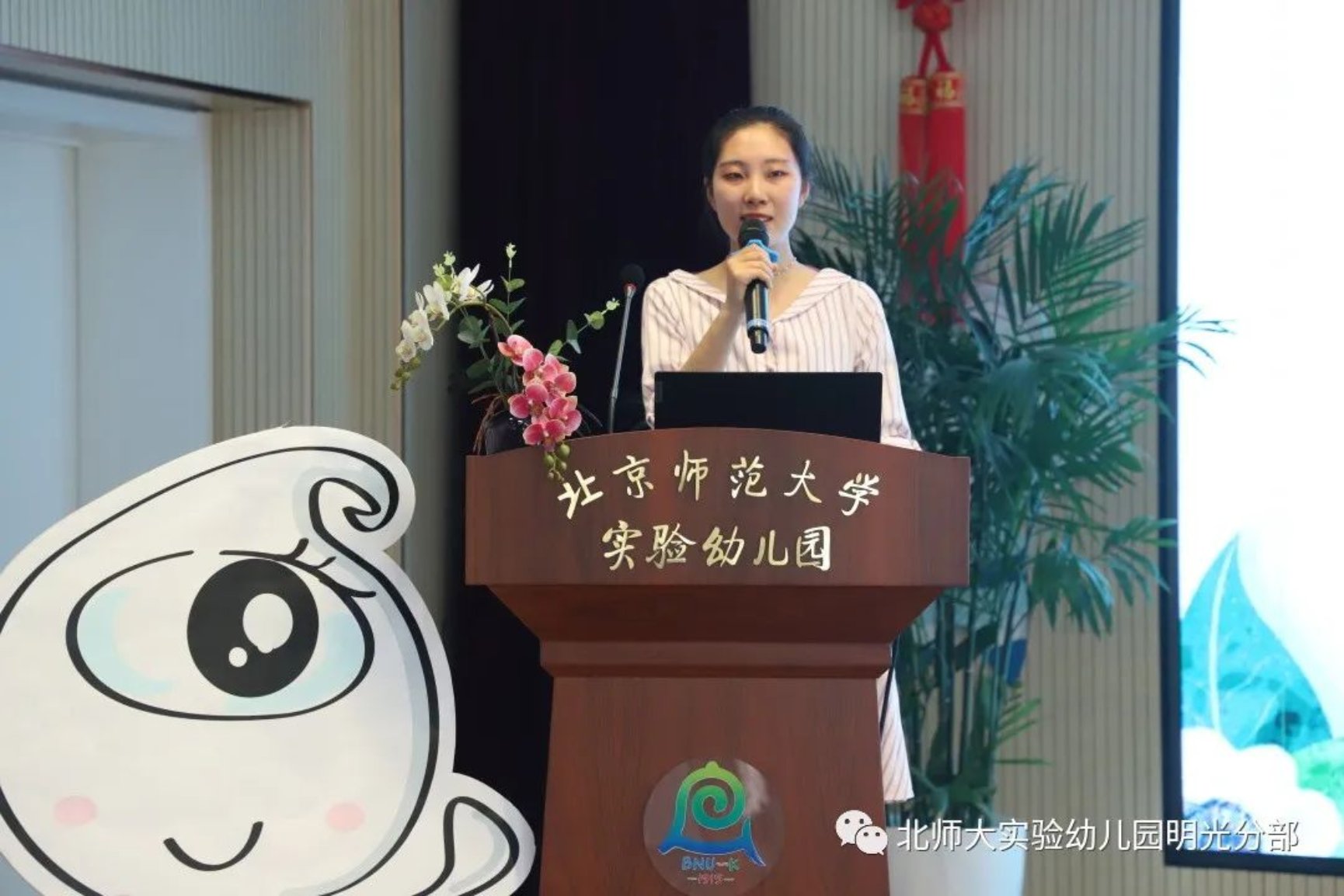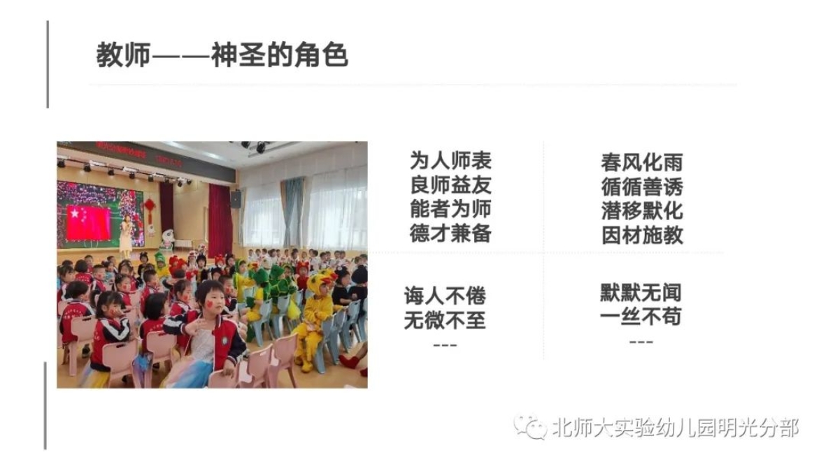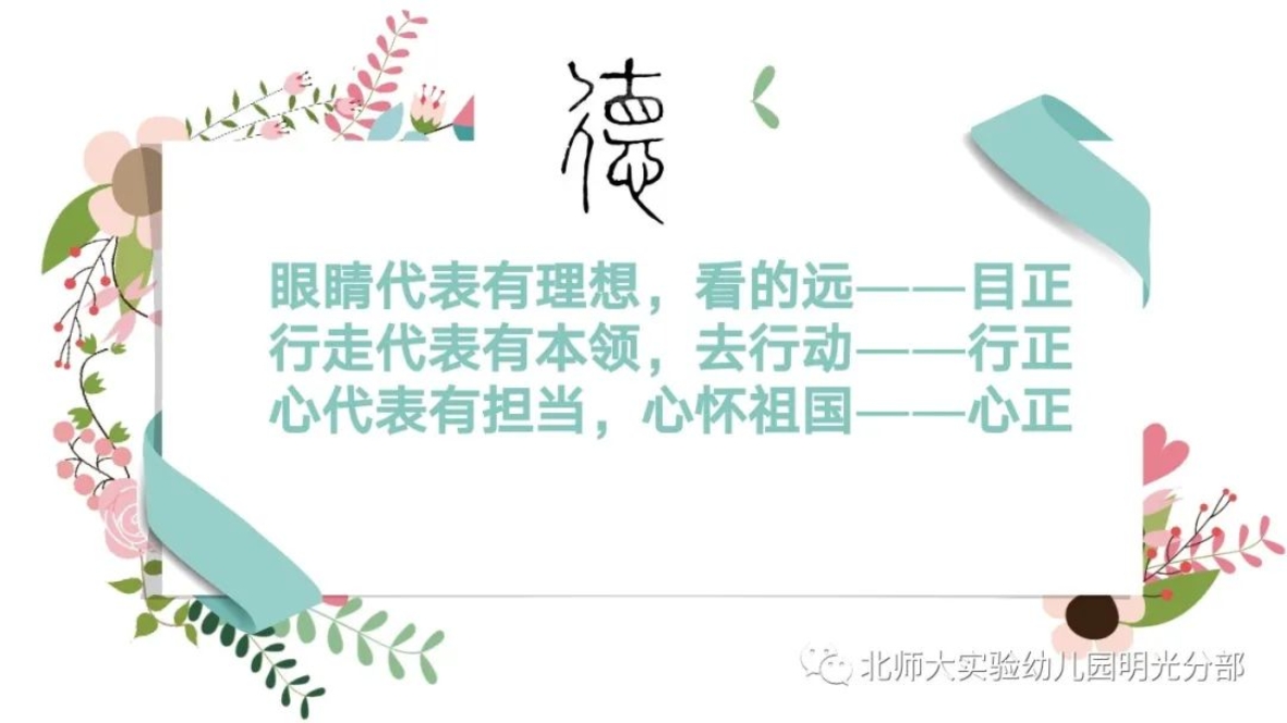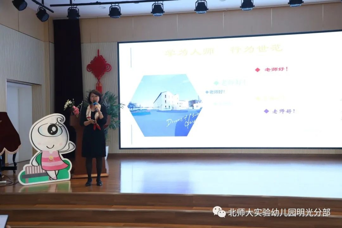 作为师德月活动策划者,邱园长用一声“老师好”以及“为人师表、良师益友、春风化雨、一丝不苟等”形容老师的成语,带大家重温教师这个神圣的身份和角色。同时带大家了解了《学前教育专业师范生教师职业能力标准》中有关师德践行的内容,她还谈到:“目正”、“行正”、“心正”则是对“德”最全面的诠释。“爱”和“成长”是幼儿园生态系统中,每一个师生、家长都需要努力前行的方向。