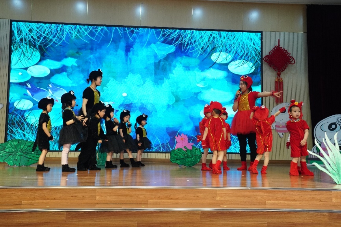 小三班的老师们变成了故事里的动物妈妈,带着全体小朋友一起表演了有趣的故事《小蝌蚪找妈妈》。