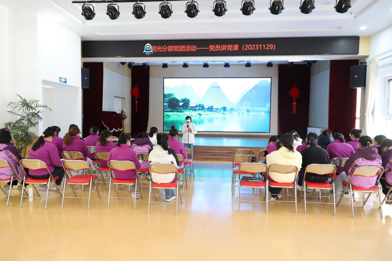 为了动员引领全体党员及广大团员和青年认真学习领会习近平新时代中国特色社会主义思想,提高对党的基本理论、基本路线、基本方略的领悟力,筑牢对党忠诚、坚定理想信念,2023年11月29日明光分部党团员20余人相聚在多功能厅聆听党员讲党课。明光分部党小组5名党员认真准备,从社会主义发展史、习近平新时代中国特色社会主义思想的世界观与方法论、红色故事等多个角度跟大家进行了分享。生动感人的故事、理论与实践的有机结合,现场的党团员在认知和情感层面加深了对党思想和理论的认识。