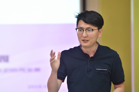望京分园保教主任杨海燕向参观老师介绍孩子们的原创绘本