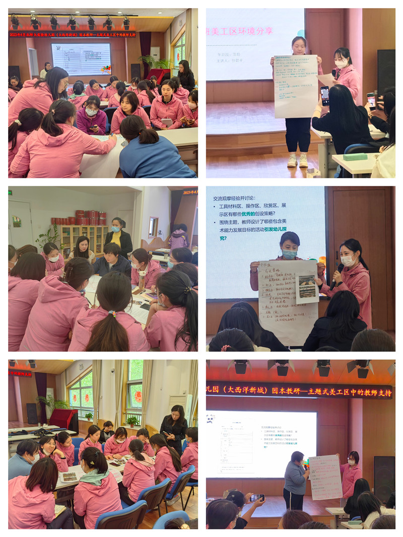 主题式美工区教研是本学期开展的第三次美工区集体教研。本次教研首先由教研员胡玥老师分享了幼儿园近九年围绕美工区创设与指导方面做的探索,随后班级教师结合教研前写的观摩的记录表,以年级组为单位讨论、交流、分享了三个被观摩班级美工区的创设策略。接着被观摩的三个班级——混二班任箭平老师、中一班刘萌萌老师、小一班张黎媛老师分别分享了班级“剪纸”主题、“染坊”主题和“春天”主题美工区创设过程中的调整思路、主题活动内容及调整后孩子的参与情况。混一班何卫玲老师分享了自己通过反复观摩、反复思考、在借鉴的基础上围绕“水墨”主题进行创设的经验。本次教研帮助教师进一步明确了高质量的主题式美工区活动离不开有准备的环境、有准备的教师更离不开通过连续性的主题活动推动幼儿持续的探究与创作。我园也将继续“以儿童团为本”,借助幼儿发展性评价,不断探寻高质量的区域活动,推动幼儿主动、全面发展。