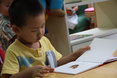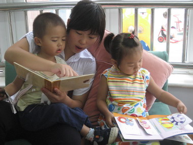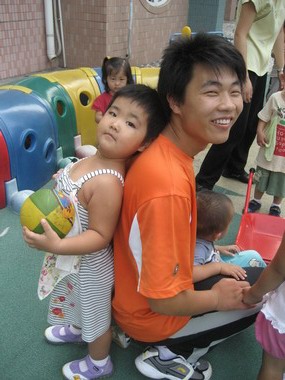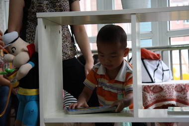 (图为 小朋友玩累了就到乐乐老师这靠一靠)
