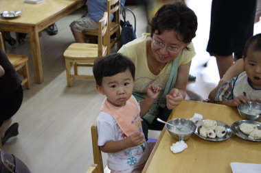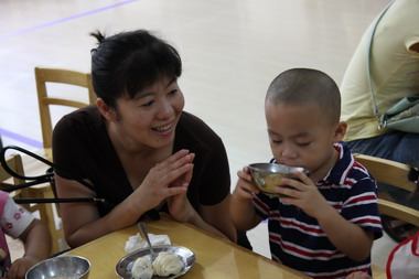 婴二班 王萍老师在鼓励小朋友自己吃饭
