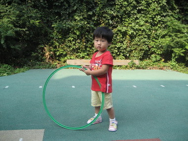 大圈圈该怎么玩,这个小朋友在想了一会后,把大圈圈滚了出去