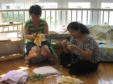 后勤主任王秀清老师(左)亲自带领老师们进行楼道地板的打蜡工作