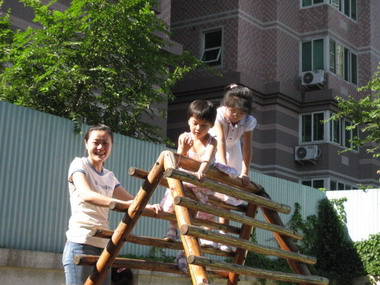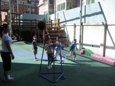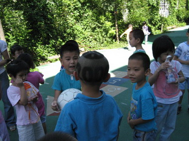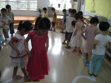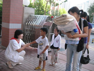 开学第一天,史老师蹲下身跟每位小朋友握手,问候。