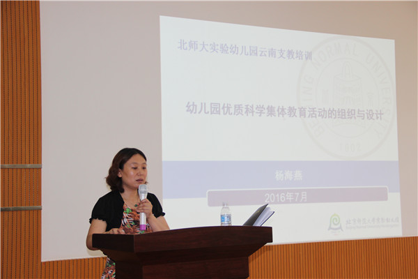 望京分园保教主任杨海燕老师先后进行了《幼儿园早期阅读教学的研究与实践》、《悦读润童心﹒书香溢满园——以开放式教育活动促进幼儿、教师和家长的协同发展》、《幼儿园优质科学集体活动的组织与设计》和《幼儿园主题活动的组织与实施》四个专题的讲座培训。单亮老师做了优秀主题案例分享。专题讲座将转变幼儿园园长、教师的教育观念和提高专业技能作为突破口,本着因园而异和解决实际问题的原则,一方面在专题讲座的培训中用大量生动、详实的案例,图文并茂地渗透我园的文化氛围、教育理念和管理经验及实践做法,另一方面鼓励他们在实际工作中加以应用,达到内化于心的过程。
