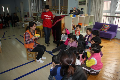 户外活动参观:“客人老师,这个玩具是这样玩的呢!”