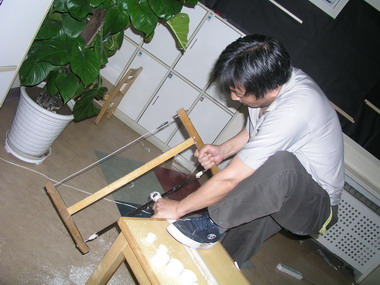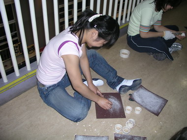 中二班老师为展览石头画,逐一磨制托架