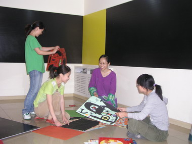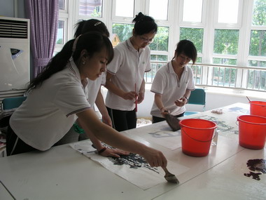 老师们在裱幼儿的水墨画为展览作准备