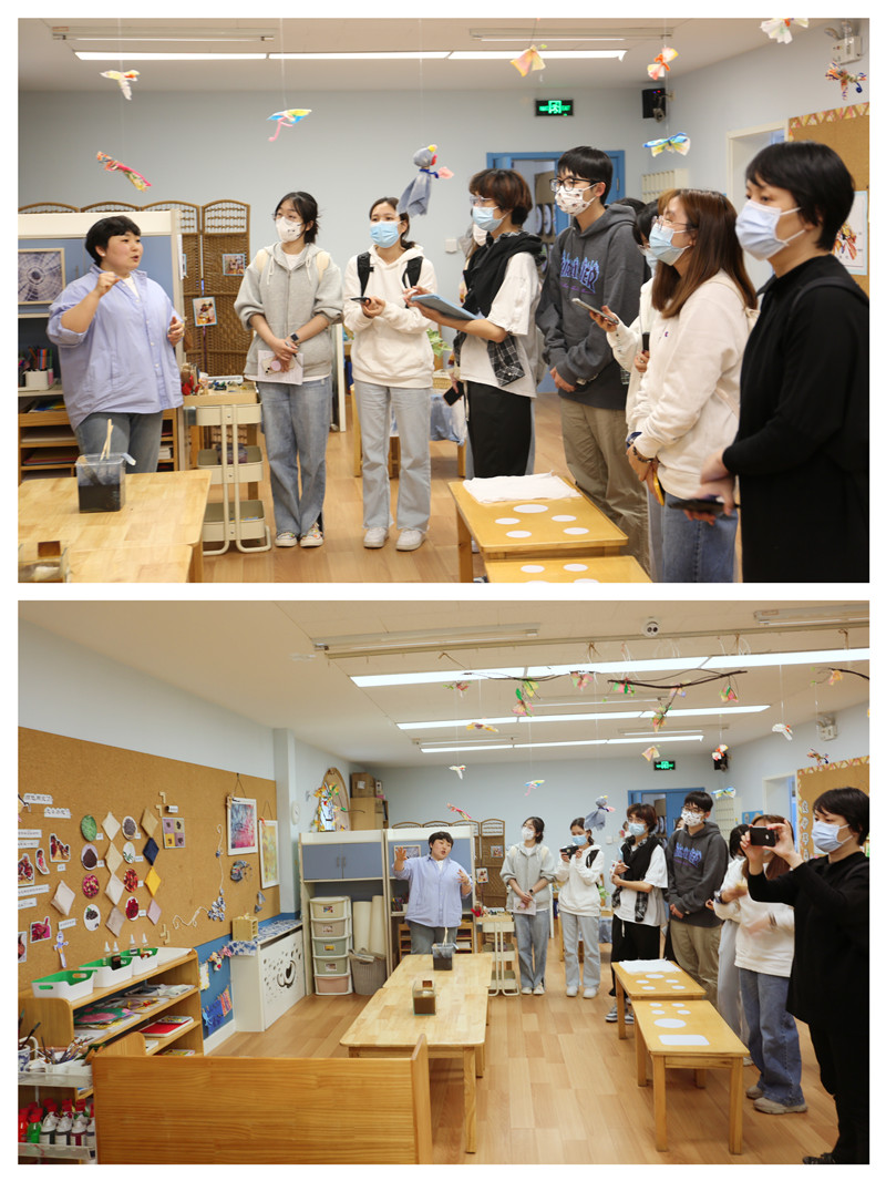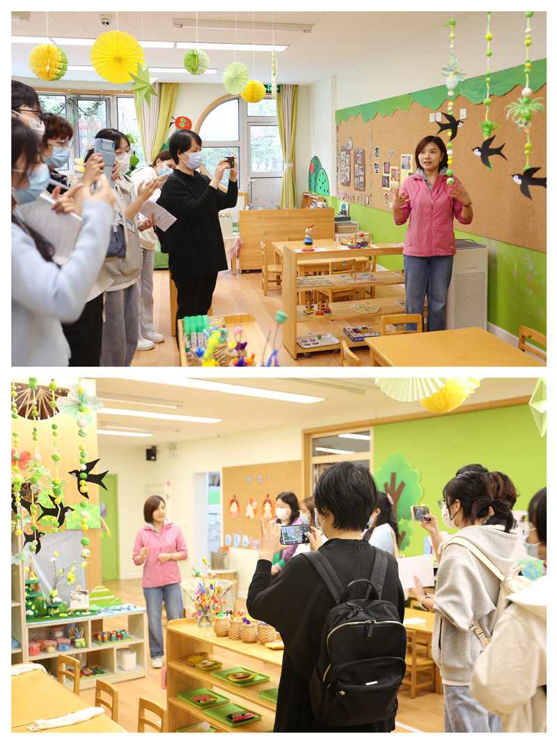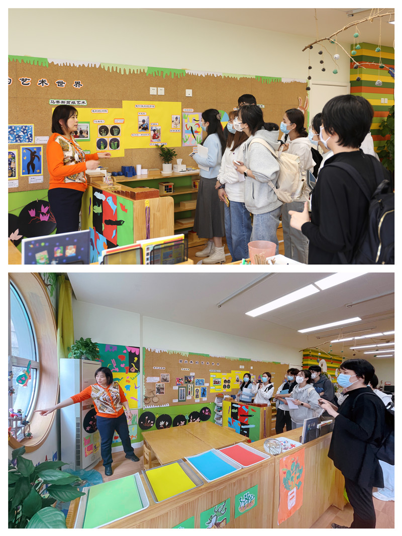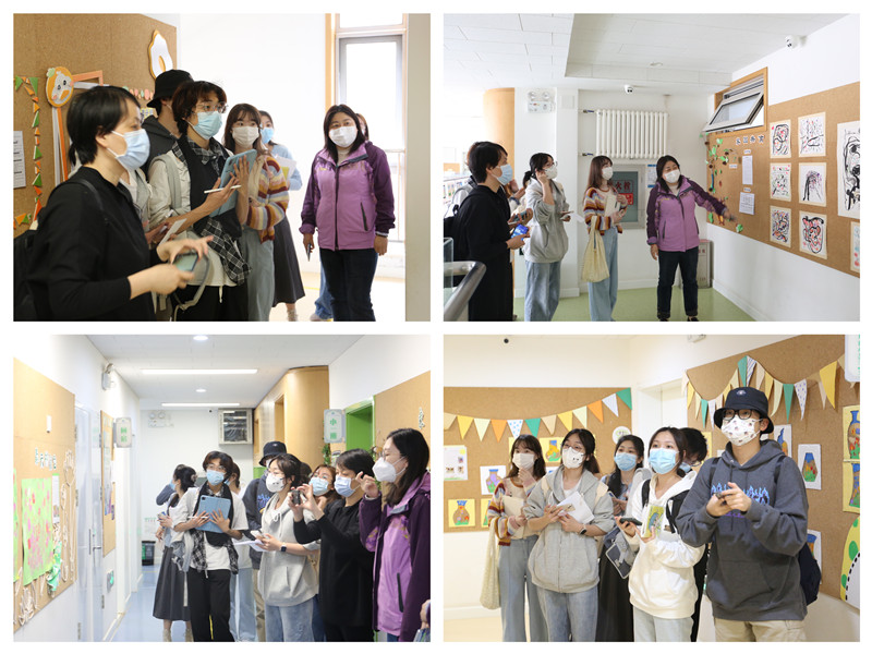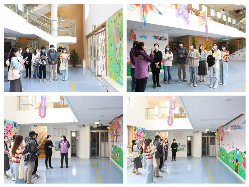 2023年3月31日,望京分园接待了北京师范大学教育学部冯婉桢副教授及9名研究生、本科生观摩。本次观摩主要对幼儿园公共环境、作品栏、班级美工区及美术活动进行了全面、细致的了解,在互相交流、学习的基础上就彼此关注的问题进行了深入研讨。望京分园保教主任赵湘、教研员胡玥首先对幼儿园“春天”主题的大厅环境进行了介绍,随后一起欣赏了全园班级的作品栏。冯老师对大厅环境及各班作品栏体现出的幼儿艺术创作的年龄特点、多样化的表现方式给予了肯定。接着冯老师和同学们一起观摩了大班任箭平老师开展的剪纸活动《春天》、中班刘萌萌老师开展的扎染活动《布上“花”开》,同时分别对小、中、大各班的美工区进行了深入了解。