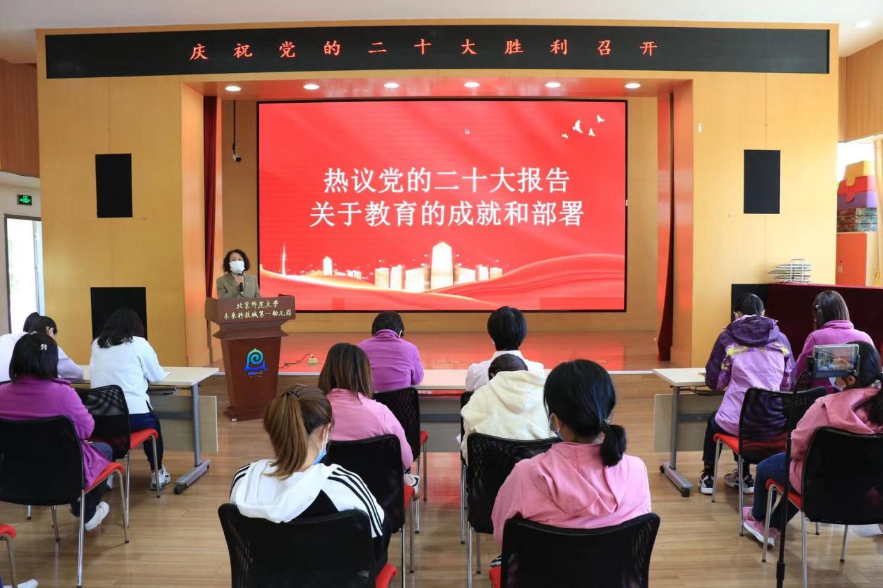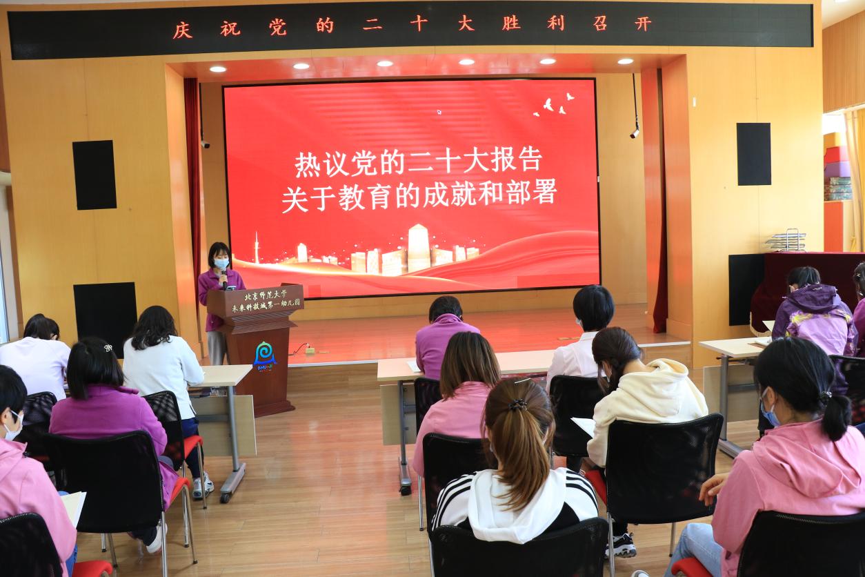 2022年10月16日,中国共产党第二十次全国代表大会在北京人民大会堂隆重开幕。北京师范大学未来科学城第一幼儿园认真组织广大党员干部及教职工收听收看相关报道,大家对党的二十大胜利召开热切关注。党的二十大报告中关于教育的论述高屋建瓴、立意深远、催人奋进,幼儿园的广大党员干部及教职工结合自身实际工作热议党的二十大报告中关于教育的成就和部署,表示将立足于本职工作,凝聚思想共识,聚焦务实作为,将二十大精神落实在实践中。