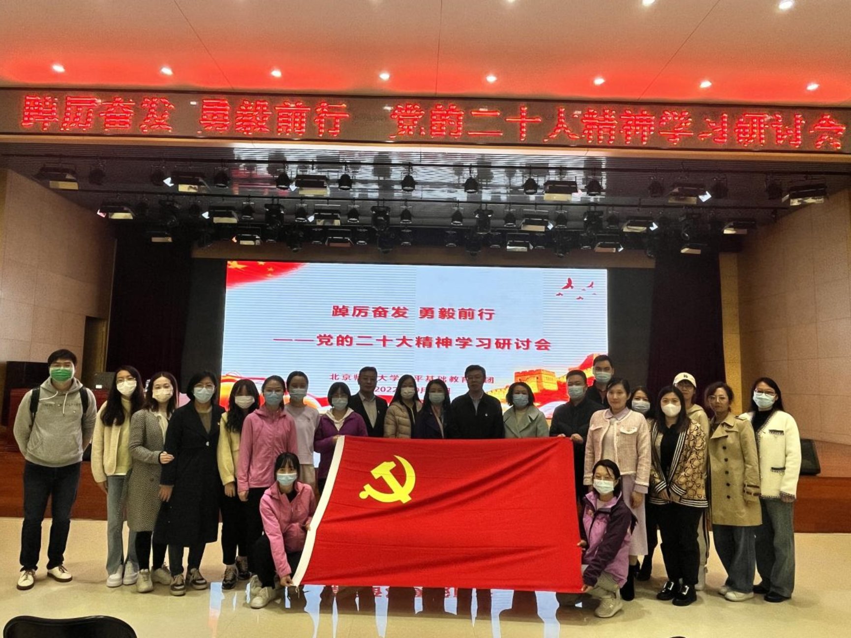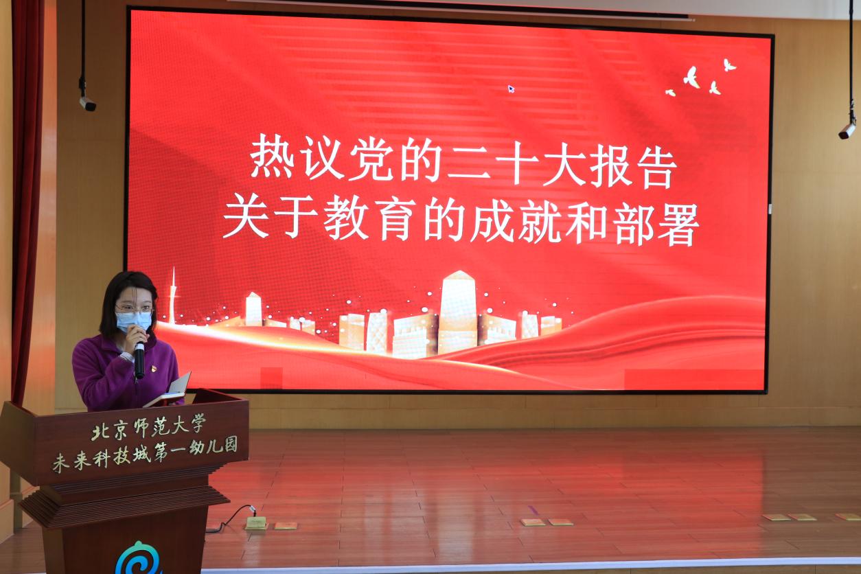2022年10月24号,北京师范大学未来科学城第一幼儿园全体党员、入党积极分子、入党申请人员有幸参加中央党校教授唐爱军“踔厉奋发 勇毅前行——党的二十大精神学习研讨会”。唐爱军教授以党的二十大中心思想——全面建设社会主义现代化国家的政治宣言和行动纲领为主题,为全体教师重点解读了习总书记在二十大报告中所提到的“十个明确”“十四个坚持”“十三个方面的成就”。唐教授精彩深入的讲座,让全体教师深入领悟了二十大精神文件。