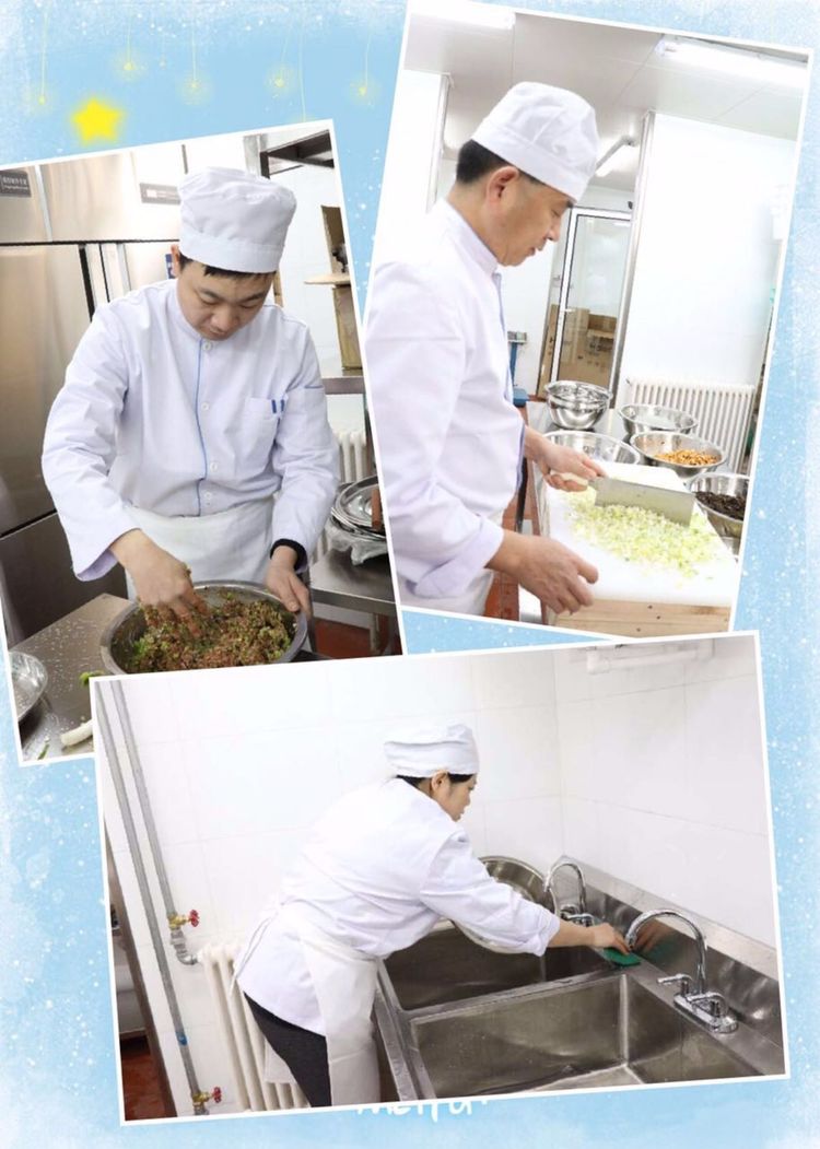 | 时光匆匆而过,冬至来临,天寒地冻,而在园内却上演着家一般的温暖,吃饺子是冬至的象征,在这个中国地道的传统节日里,厨房师傅们你和面、我打陷、你擀皮、我煮水,不辞辛苦,精心地为全园老师准备了饺子盛宴。