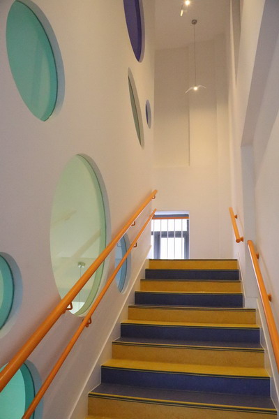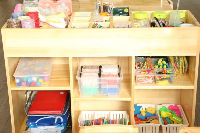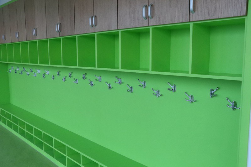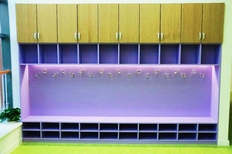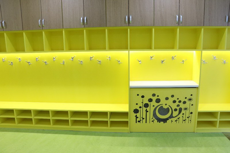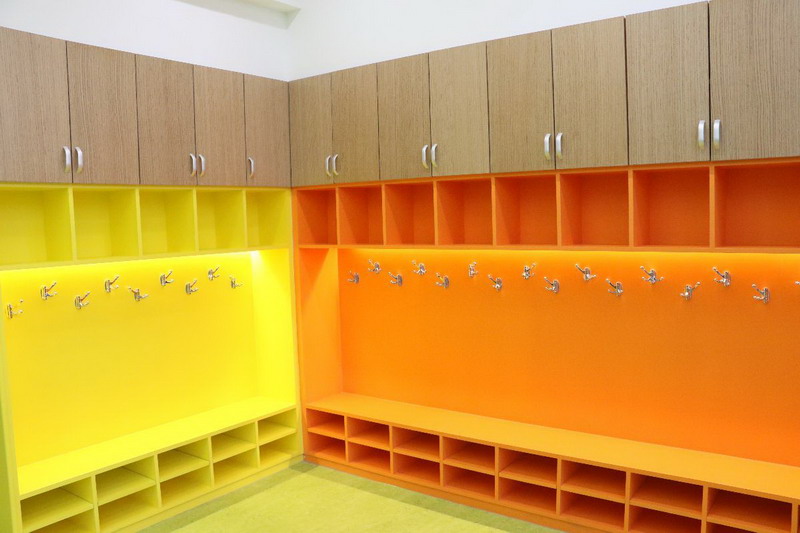 色彩绚丽、整齐划一、设计独到的柜子添加了几分童趣,更便于孩子们愉快地使用。