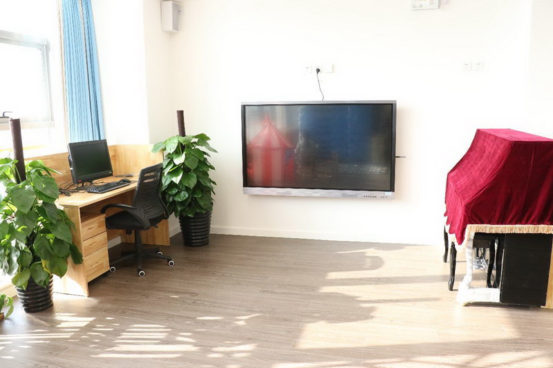 办公区绿色盎然,生机勃勃,几盆绿植清逸悠扬,一架钢琴古朴典雅,一台现代化一体机突显科技教学,文化办公与绿色办公融为一体。