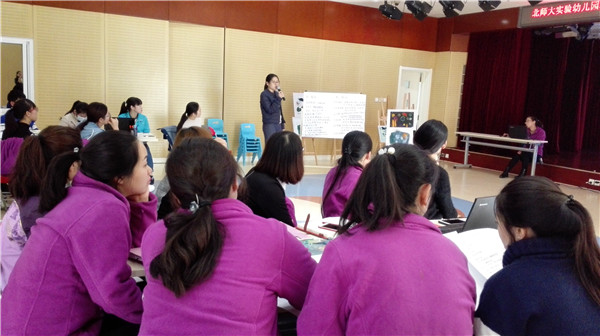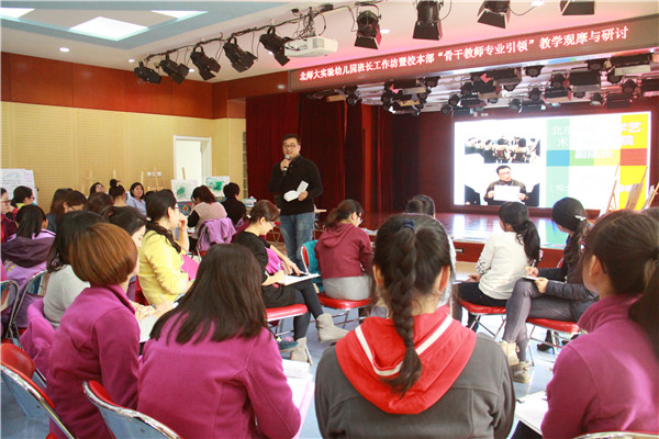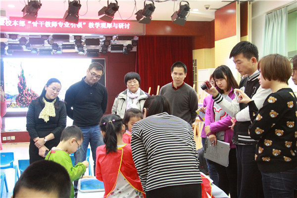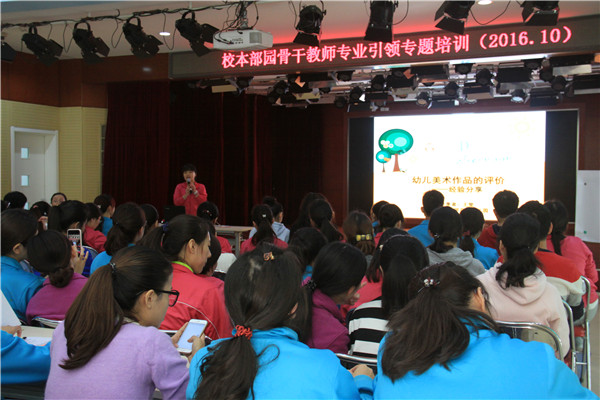 校本部园从2015年10月就启动了“骨干教师专业引领”研修活动。区级以上骨干教师要结合自身擅长的内容,面向全园教师进行理论培训和实践教学示范,以此发挥骨干教师的辐射和引领。此活动既有助于年轻教师从骨干教师身上汲取养分,获取经验,也有助于骨干教师梳理、固化和提升自身的经验,以此达成在经验的传递和引领示范中,锻炼队伍,促进教师梯队建设。