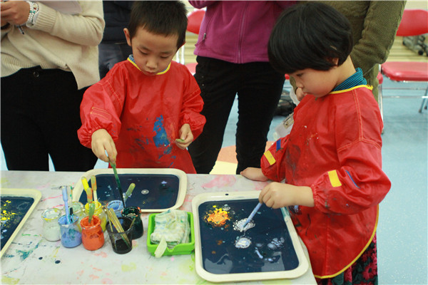幼儿以参观画展的形式欣赏自己第一次创作的星空作品