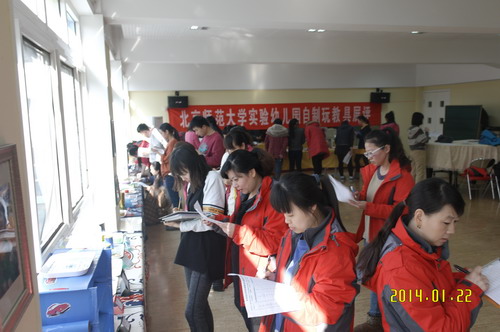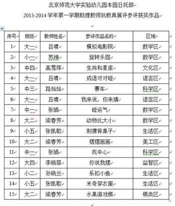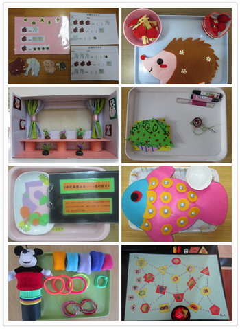 为进一步推进助理教师玩教具制作的积极性和专业性,促进助理以上教师对玩教具制作的重视以及日托部助理以上教师之间的相互学习和分享,2014年1月22日中午,日托部专门组织了“助理教师玩教具展评”活动,每位助理教师从本学期制作的玩教具中挑选3—5件参加展评,部门所有助理以上教师全部担任评委,评委教师除了在主任设计的玩教具评价表上打分并写出优点和建议之外,资深的班长教师还在现场与助理教师进行了互动、交流与反馈。最终,在综合考虑玩教具的创新性、年龄适宜性、精美性、操作性、安全性等条件的基础上,9位教师制作的15件优秀玩教具在本次展评活动中脱颖而出。