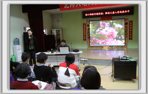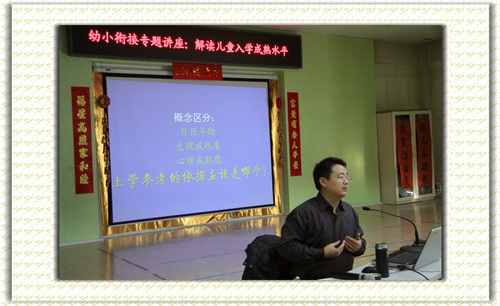 2010年1月7日,我园特邀教育学部钱志亮老师为全体大班幼儿家长做《解读儿童入学成熟水平》的专题讲座,这是我园幼小衔接系列活动之一。 钱老师从孩子入小学后将会面临的各种挑战与变化入手,深入浅出地解读了幼儿入学所应具备的多种心理发展水平,并提出了相应的促进措施。讲座现场气氛热烈,钱老师生动幽默的讲解令现场每一位家长受益匪浅,为家长理解并做好幼小衔接工作奠定了良好的基础。 |
