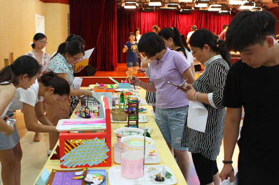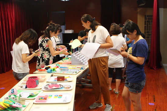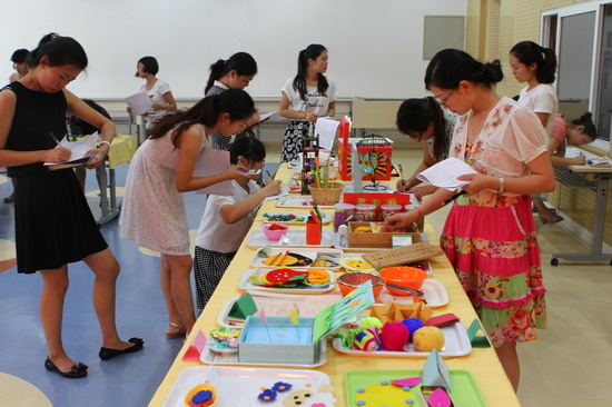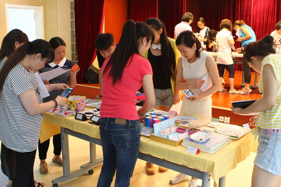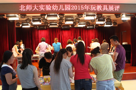 2015年7月3日,校本部园组织了全园玩教具展评活动。一方面,是为了积极响应总部“百年有园”成果学习的号召,将我园新出版的《幼儿园自制玩教具》一书与助理教师的实际工作相结合,给助理教师搭建展示专业技能的平台和机会;另一方面,也是希望借助助理教师的玩教具展评,为部门与部门之间、班级与班级之间提供相互学习、交流和借鉴、分享的机会,以此拓宽教师的思路,让自制玩教具更好地为课程建设以及幼儿发展服务。