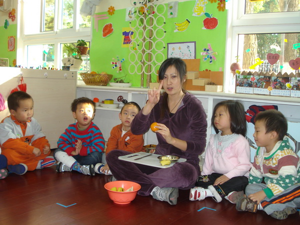 小一班实习的杨树池老师带领幼儿做水果的主题活动