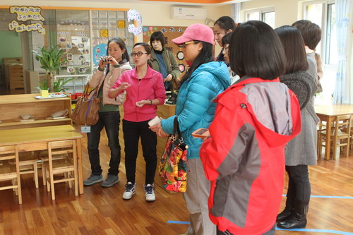 日托保教主任杨曦、全托保教主任滕瑾、培训部主任徐兴芳、教研员鞠亮带领教师沿不同路线参观幼儿园园所和班级环境