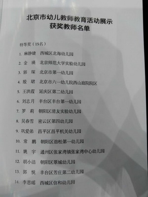 2015年5月,北京市启动了幼儿教师教育活动展评活动,我园推荐金瑛老师参加。历经海淀区初评、复评、北京市终评三个阶段,最终金瑛老师获得了北京市幼儿教师教育活动展评特等奖的好成绩。这一荣誉既是对我园先进教育理念与高质量保教工作的认可,也是对我园优秀管理团队及教师团队的肯定。