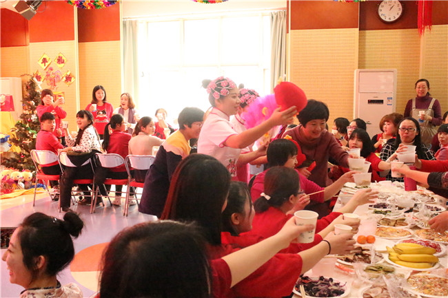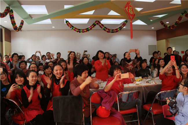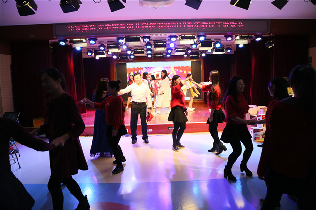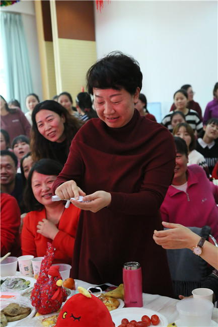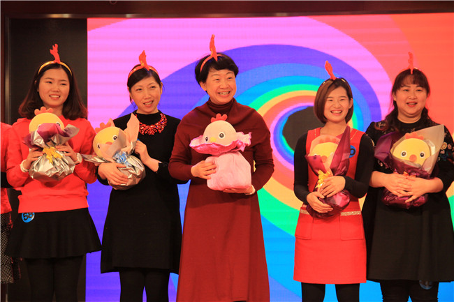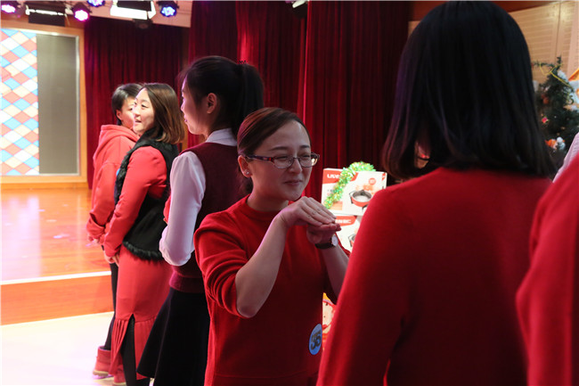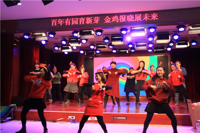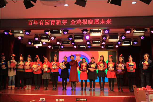16位本命年老师带着新年的喜气,跟随欢快的节奏,跳起了《勤劳的金鸡》,现场气氛非常热烈。热舞之后,16位属猴的老师为属鸡的老师送上了特别的礼物。黄园长接受了礼物,并希望明年能够将这份喜气传递下去。