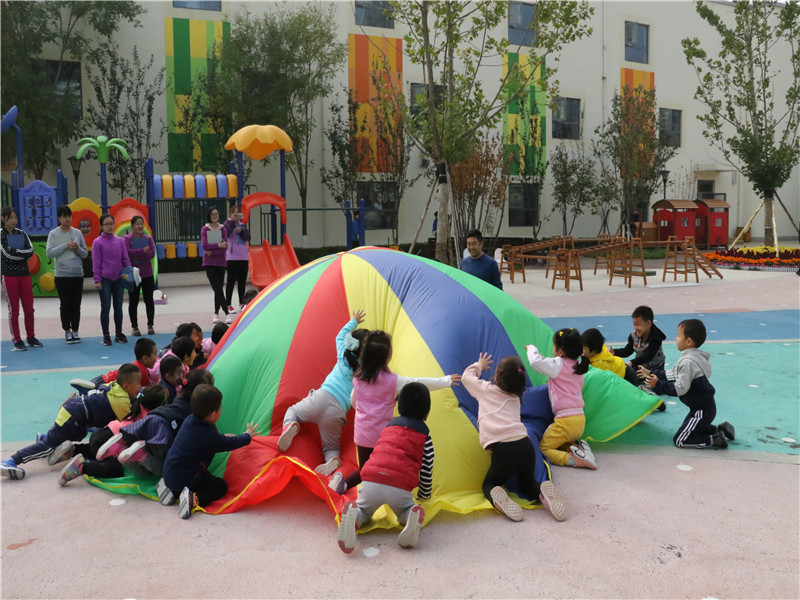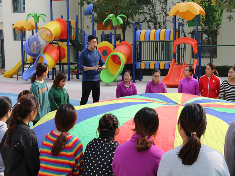 最后,徐老师通过教师参与式的培训,以“出来了”和“彩虹伞”为例,现场分享了体育游戏的组织方法,教师在体验中学习和成长,对于幼儿体育活动的组织有了进一步的理解和认识。