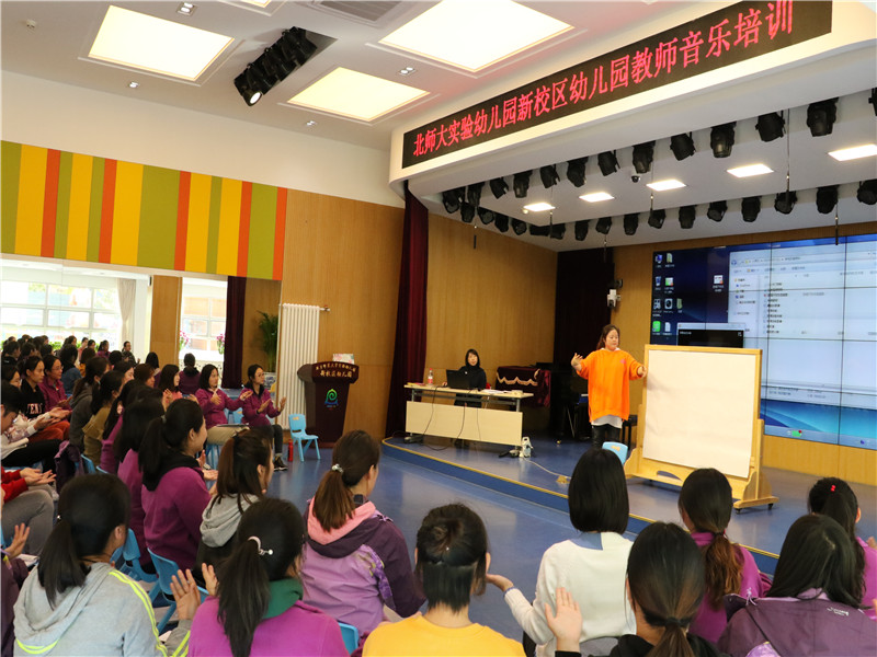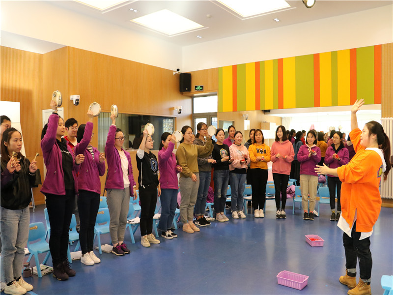 中午,吕老师首先从基本的音符、节奏、节拍、音感等方面为教师普及了不同年龄段幼儿适宜的音乐活动内容及常见的表演方式。其次,通过教师现场参与《调皮的小鼓》和《苹果丰收》两个活动,具体分析了音乐活动的教师组织策略及基本规范。教师在体验中学习着每一个环节的组织,切实领会着如何将音乐融入幼儿的游戏与活动之中。