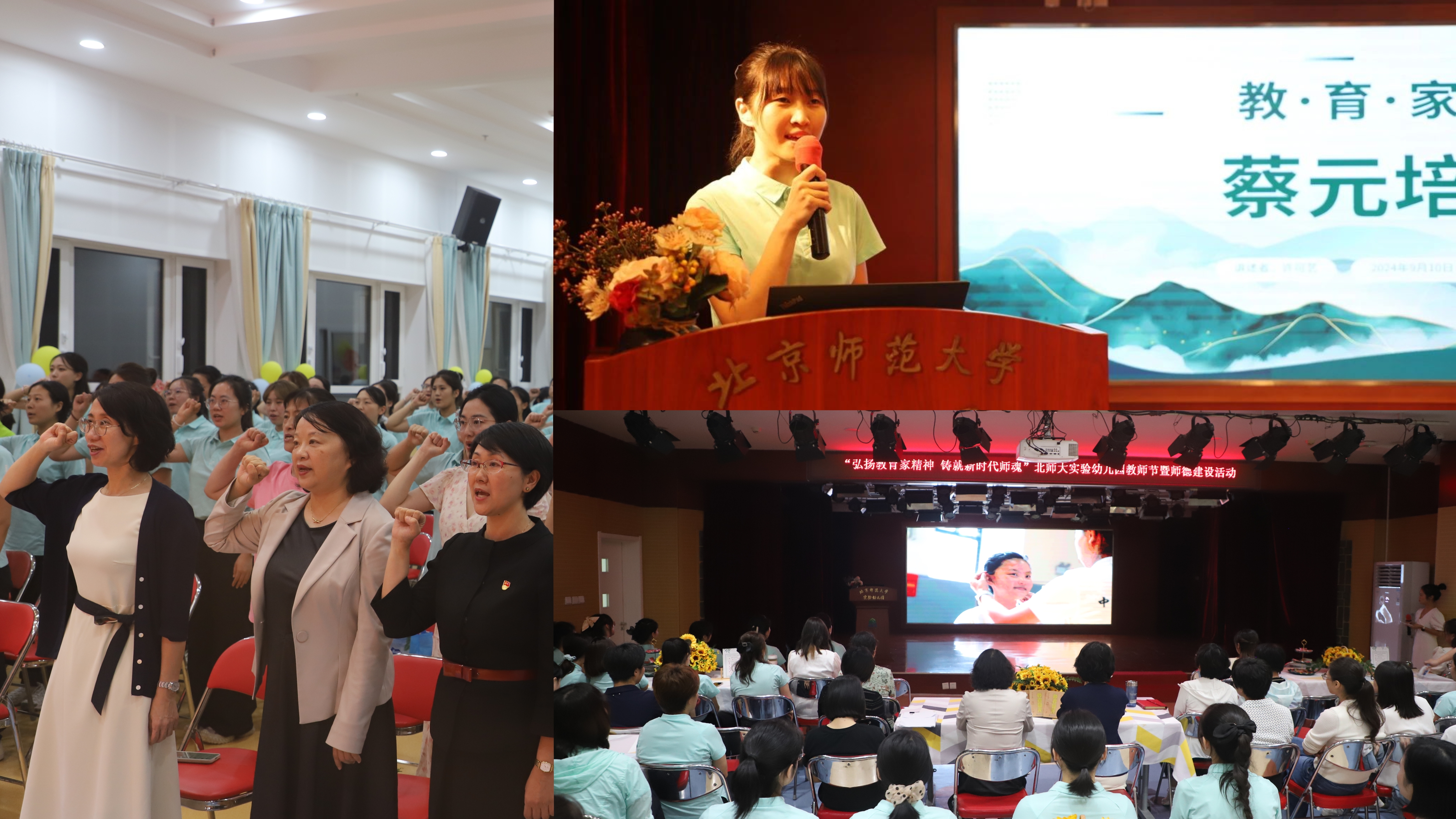 杜书记、夏园长走进班级,跟孩子们亲切互动,给老师们送上节日的祝福、礼物与鲜花;走进厨房、保健室,感谢后勤各岗为孩子们健康成长保驾护航;跟行政老师沟通交流,了解学期规划,共商发展大计。在各园精心策划的教师节庆祝活动中,杜书记、夏园长与全园老师们共同回顾教育家精神的内涵,倾听近现代教育家以及身边师德榜样的故事,同唱教师主题歌曲,为从教秩年的教师颁发证书等,用满满的仪式感致敬潜心育人、深耕教育的最美实幼人。