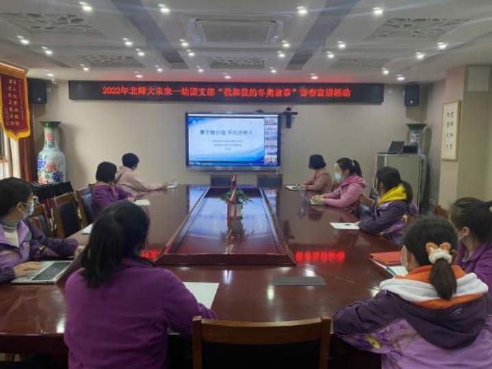接下来,三位青春宣讲团成员:冬奥会开幕式引导员于艺铭、冬奥会志愿者张颖、冬奥会OIS大学生记者团王雅诗,三位同学先后分享了自己亲身经历的冬奥故事。宣讲团生动的讲述、专业的态度和敬业的精神让幼儿园全体团员教师们感受到了师大青年学子蓬勃向上的青春风貌,深受鼓舞。
