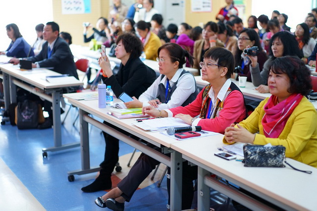 在校本部园多功能厅,来自日本、台湾地区的专家及150多位全国各地教育工作者深入研讨“环境育人”的主题。校本部园执行园长杜军主持研讨会并做了“在‘以儿童为本’的环境中促进幼儿主动发展”的专题发言,以案例的形式向嘉宾呈现了该园“以儿童为本”的环境创设研究与实践。来自日本友好园柏幼稚园的吉田治子女士做了“环境中的教育——日本柏幼稚园的实践”的专题发言,呼吁重视和发挥家庭、社会教育的功能,强调推动家庭、幼儿园、社会一体化的教育观点。台湾亚洲大学幼教系主任卢美贵教授在“幼儿园是我的‘梦工厂’- 课室翻转的美学实践”中提出,幼儿教师的“课室翻转”是基于全人的养成目标,能够找回幼儿学习动机及其学习的主体性。