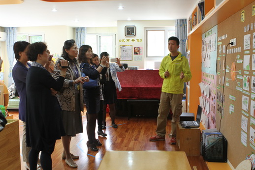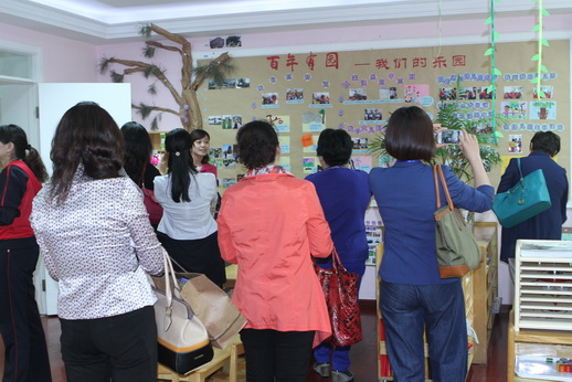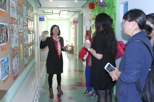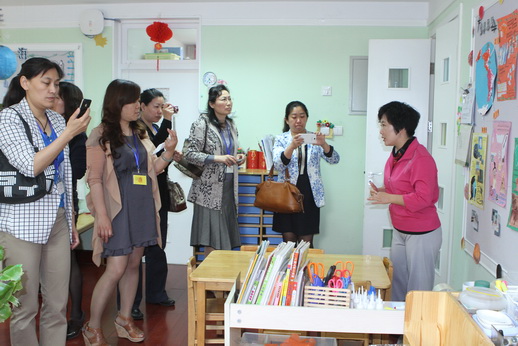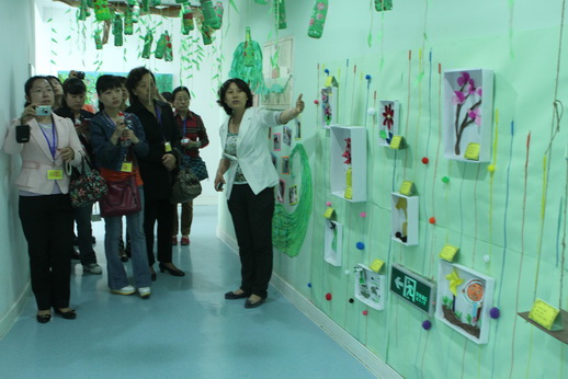 参观教师分为三组与跟培训部主任徐兴芳、日托保教主任邱守和全托保教主任杨海燕转公共环境和班级环境