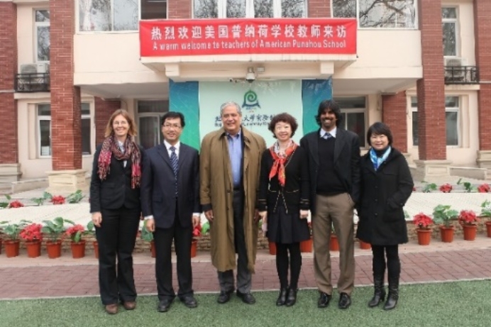 普纳荷学校(Punahou School),始建于1841年,是 “全美排名前五的中学”,也是两位总统孙中山先生和奥巴马先生的母校,我园自2010年,与普纳荷学校成为姐妹校,开展了10余期教师专业发展培训项目,互访多次,普纳荷学校校长Jim先生,国际中心前主任果华老师、Emily女士以及现任主任Chai Reddy 先生也都来访我园,深化了两校的合作与交流。疫情期间,两校之间互相分享了线上的教育资源。2015年,时任国际中心主任的Emily女士出席我园2015年的百年庆典,参加了我园举办的“蒙养百年 倡导开新”国际学前教育大会,并在分会场做专题发言。