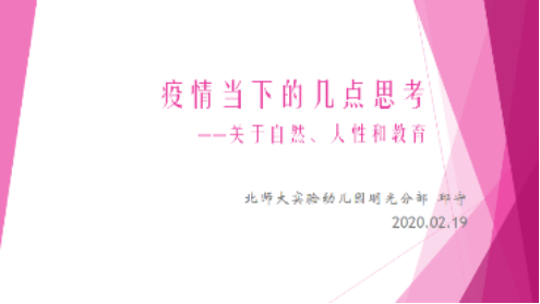 2020年2月19日,明光执行园长邱守老师以“第一课”的方式,开启了明光新学期的“线上工作”。从主题《疫情当下的几点思考——关于自然、人性和教育》的分享中,通过各种事件和图片,让大家强烈感受到2020年全世界范围遭遇的各种大自然的不幸。了解到当下疫情中各种新闻报道中不同形象和事件中所展现出的不同人性,以及结合滚球app作为教育者的身份,带滚球app拓宽疫情之下对自然、人性和教育的思考。