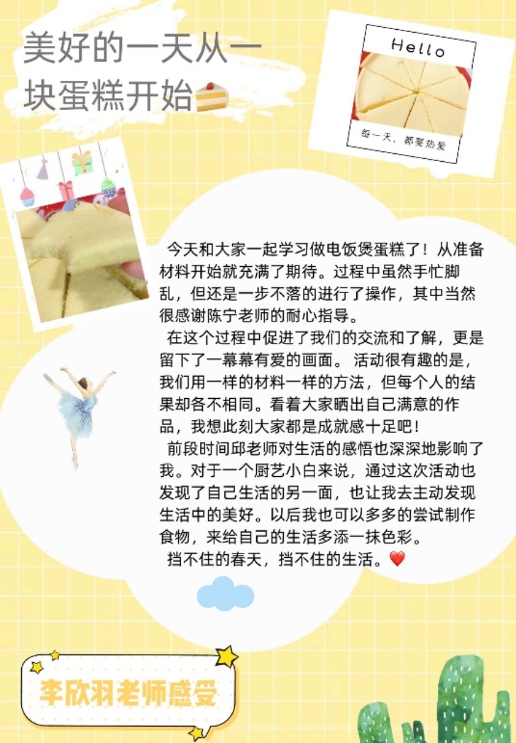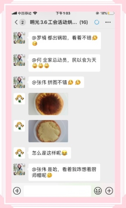 3月6日下午,明光工会小组长陈宁老师自身就是“烘焙爱好者”,她考虑到有些老师家中烘焙工具有限,选择了最简单的电饭煲蛋糕制作,在线示范和指导。一下午的快乐时光,大家工具各异,情况各异,状况百出,笑点不断,成品卖相也各不相同,但活动中无论个人还是全家总动员,大家都愉悦了身心,乐意融融。生活是需要这样去触摸和感受体验的。