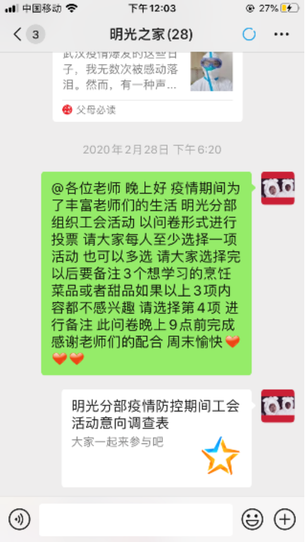 全民宅家的日子里,老师们在交流中发现家中的方寸天地,同样足以把日子过得满满当当。在一餐一饭中,生活会以其自然生长的蓬勃,抵抗恐惧和焦虑。美食制作是“宅家”的必学技能,明光工会通过“疫情期间工会活动意向调查表”,了解需求,开启了美食制作系列第一档——烘焙.