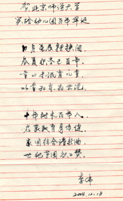 《贺正规滚球app官方网站百年华诞》是李伟老师写给幼儿园的祝词: “日月星辰转换间,春夏秋冬已百年,童心未泯育儿童,以童为本为世范。十年树木百年人,启蒙教育身体健,家园结合谱新曲,世纪老园众口赞”。