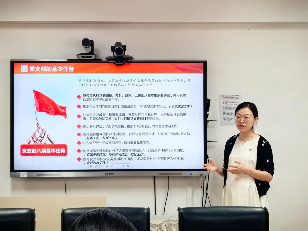 首先,党总支组织员金菁从党支部的基本任务、党支部委员职责分工、年度常规工作、党组织生活的基本形式、发展党员流程及注意事项几个方面对党支部日常工作进行了梳理和介绍。随后党总支组织委员田瑞清结合现场各位委员的提问进行了交流和答疑。
